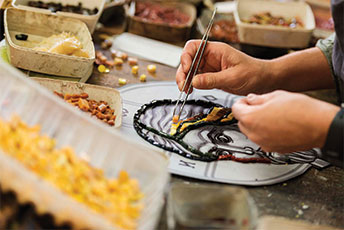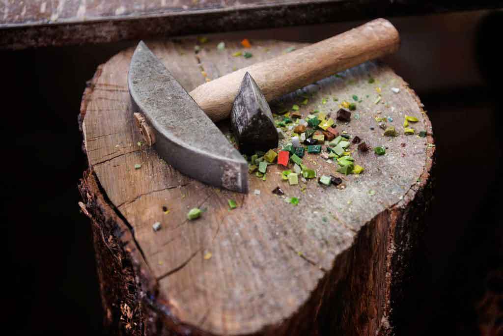 Favret Mosaici si distingue per l’attenzione che rivolge verso le richieste del committente. Ogni fase di lavorazione è seguita con la massima cura. Si sviscera e si analizza l’idea, traducendola in un bozzetto, a colori o in bianco e nero, di piccole o grandi dimensioni. Si scelgono i materiali più adatti alla realizzazione, sempre di altissima qualità, si adatta la foggia di ogni singola tessera al disegno, rigorosamente a mano, assicurando così l’unicità dell’opera finale e il pieno controllo sulla realizzazione del progetto. L’assemblaggio si esegue nel laboratorio, porzionando le singole aree del mosaico, laddove le dimemsioni lo richiedano, per poi unirle di nuovo insieme in fase di allestimento, che può avvenire in ogni parte del mondo, sempre seguita passo passo da Favret Mosaici, disponibile a recarsi in loco.